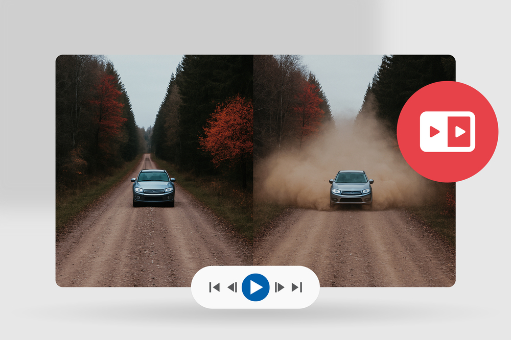 Both clips play in perfect sync – during play, pause, scrubbing, fast forward, slow motion, and even frame-by-frame.